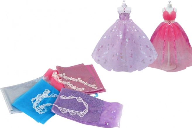 - Kaj je v kompletu: 5 tkanin za obleke, 2 stojali za obleke, pisane in srebrne bleščice, trak, nit, vzorčnik, šablona z merami in ilustrirana navodila.