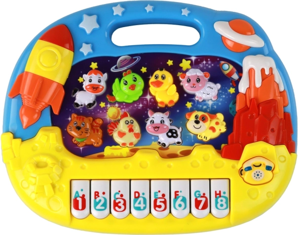 - Vesoljski motiv razvija otroško domišljijo ter povezuje tipke z živalskimi zvoki in številkami.