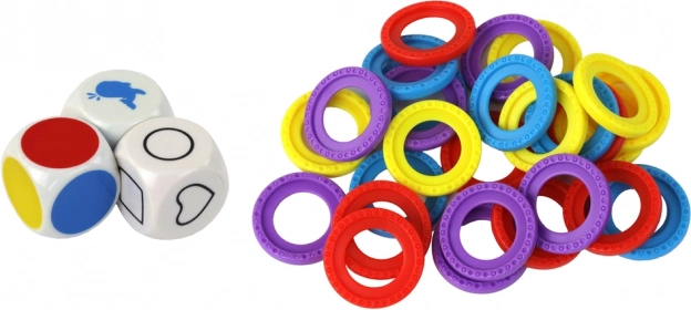 - Vsebina paketa: sestavljiva igralna plošča, 3 kocke, 28 obročkov (4 barve po 7 kosov: vijolična, rdeča, rumena, modra)