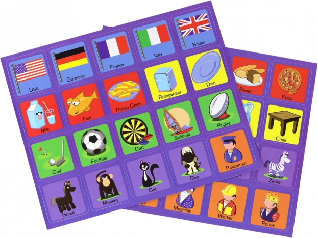 Set 40 ilustriranih kart s predmeti, živalmi in simboli pomaga pri prepoznavanju in na zabaven način širi angleško besedišče.
