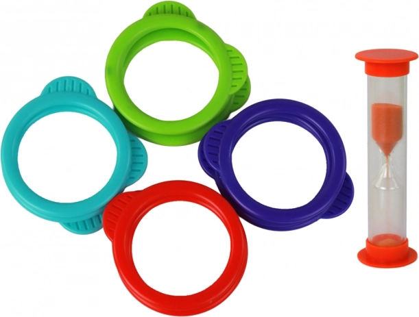 Set vsebuje obroče v štirih barvah in peščeno uro za hitro tekmovalno rundo. Nastavite čas in poskusite natakniti čim več obročev, preden se pesek izteče.
