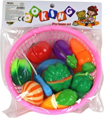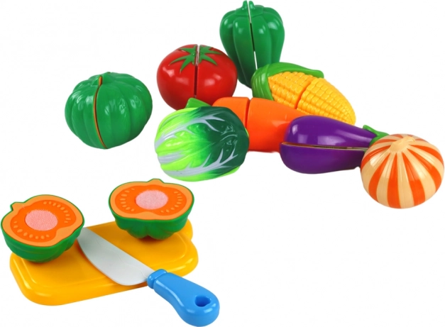 Vsak kos zelenjave je razdeljen na polovici, povezani z ježkom. Otroci lahko plastničnim nožem »režejo« znova in znova ter tako razvijajo fino motoriko in potrpežljivost.