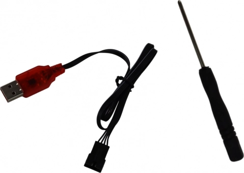 V paketu najdete vse za takojšen začetek: model z akumulatorjem 7,4 V 500 mAh, USB polnilnik, oddajnik in nalepke za personalizacijo. Dodati je treba le 2× AA bateriji za upravljalnik.