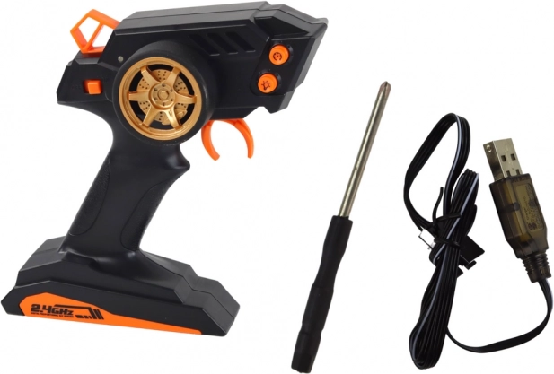 Model je priložen z 7,4 V akumulatorjem in USB polnilnikom za udobno polnjenje. Daljinec deluje na 2× AA 1,5 V (nista priloženi). Z merami približno 42,5 × 22 × 10 cm ponuja impresivno razmerje med velikostjo in zmogljivostjo za res zabavno vožnjo.