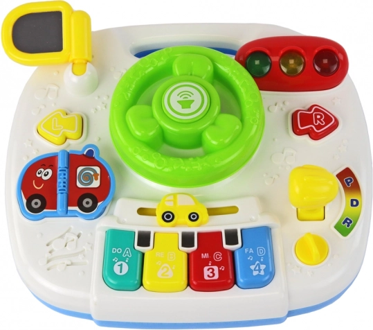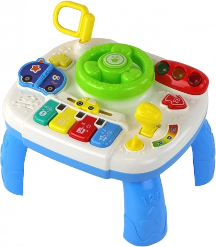 Ta barvita interaktivna mizica služi kot igrača 2v1 – bodisi kot samostojna mizica na nogicah ali kot viseča panelna plošča za posteljico zahvaljujoč praktičnim nosilcem. Središče zabave je otroški volan s smerniki, hupo in svetlobno signalizacijo, ki pomaga pri učenju osnov prometne vzgoje ter koordinacije rok in oči.
