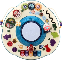 Viseča tabla s štirimi figuricami v štirih različnih barvah razvija otrokove ročne in logične spretnosti, spodbuja ustvarjalnost in koncentracijo. V samem zgornjem kotu mize je boben, okoli katerega se živali vrtijo, kar doda element gibanja in zanimivosti.