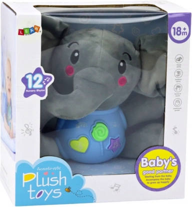 Ljubek interaktivni plišasti slon v modri barvi (19 cm) iz mehkega materiala ponuja tri gumbe: zvoki narave, angleške izštevanke in 5 veselih melodij. Odlična igrača za razvoj čutov in jezika od 18 mesecev, napajanje 2× AA.