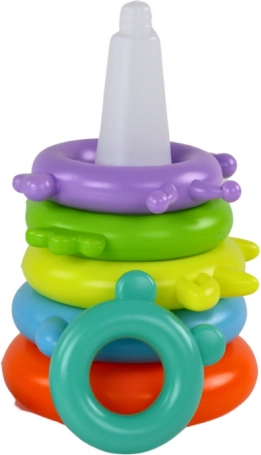 Zabaven zložljiv stolp z žirafo in 8 barvitimi obročki razvija fino motoriko, koordinacijo oko–roka ter logično mišljenje. Zahvaljujoč varni plastiki je trpežen in enostaven za čiščenje. Primeren od 12 mesecev, izpolnjuje standarda CE in EN71. Dimenzije 29 × 14 × 14 cm.