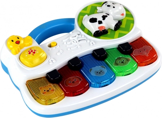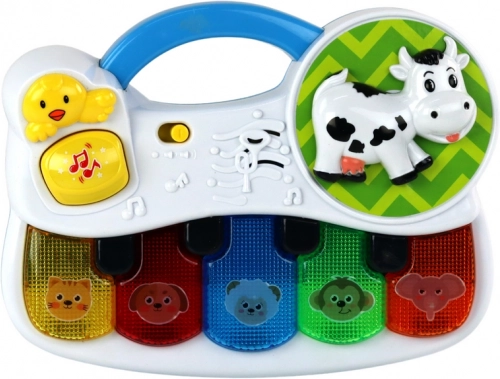 Odkrijte svet glasbe s tem kompaktnih mer klavirčkom za najmlajše. Ponuja 5 barvnih tipk z živalicami, svetlobne učinke in zvoke, ki spodbujajo otrokove čute. Po pritisku rumenega gumba zaigra veselo melodijo, vrtljiva kravica pa pritegne in zabava. Idealno za razvoj fine motorike, slušnega zaznavanja in domišljije.