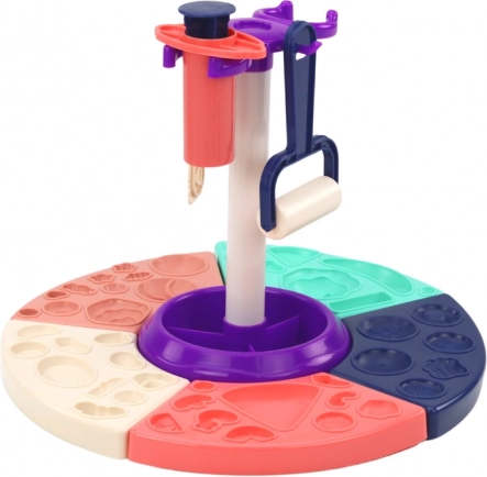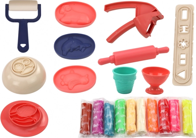 Del paketa so kuhinjski iztiskalnik, 2 valjarja, skledice, krožniček in lončki ter različni modelčki za sladoled, sadje, zelenjavo in okraske. Set podpira razvoj domišljije, urí fino motoriko in uči otroke ustvarjalne igre brez nereda.