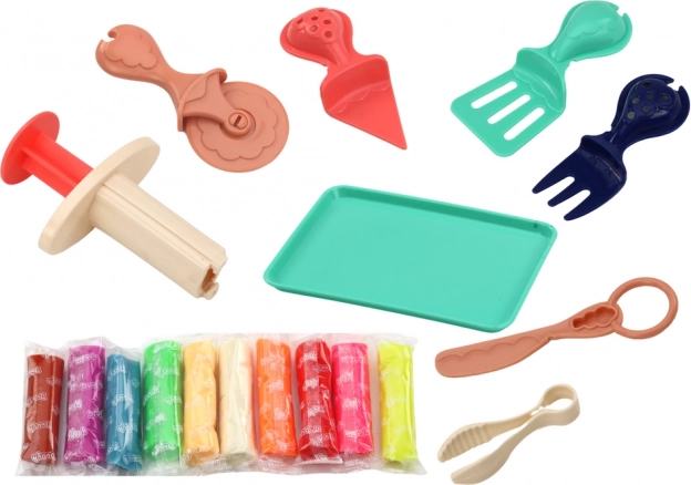 V kompletu so spatula, valjar, kleščice in druga pripomočka. Otroci urijo fino motoriko in kreativno delo z modelirno maso.