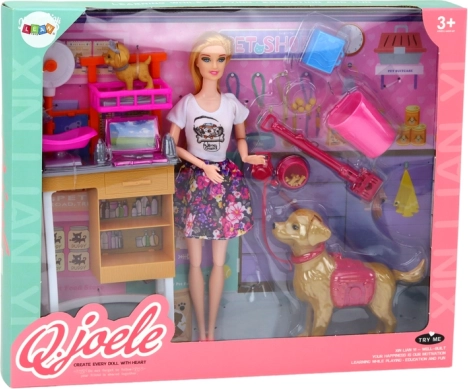 Ta barvit set povezuje svet domišljije in učenja – punčka v cvetlični obleki skrbi za pse in mačko, jih kopa, krtači, tehta in hrani. Otroci se preizkusijo v vlogi skrbnika in malega veterinarja ter spoznajo, da je del nege tudi čiščenje za ljubljenčki.