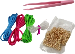 Z raznobarvnimi vrvicami (rožnata, zelena, modra), ribiško vrvico in dodatki si lahko otroci oblikujejo nakit za različne priložnosti. Priložene so tudi prikupne elastike in sponke za lase ter viseči uhančki na zaskoček – primerno tudi za otroke brez prebodenih ušes.