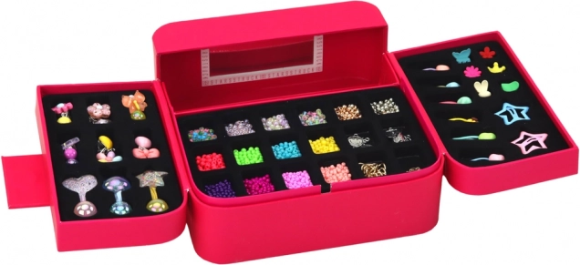 Več predalčkov za enostavno razvrščanje perlic, uhanov in dodatkov. Ogledalce olajša preizkušanje končanih stvaritev in poskrbi, da je vse na svojem mestu.