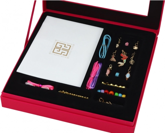 Vsebuje vrvice, najlone in ogrlico, ki jo lahko uporabite tudi kot dvojno zapestnico – možnosti je res veliko. Vse je shranjeno v elegantni škatli, zato lahko otroci komplet zlahka odnesejo s seboj kamorkoli in imajo red v vseh sestavnih delih.