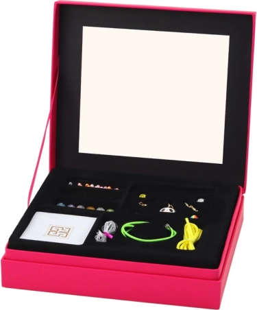 Ustvarjalni komplet za izdelavo zapestnic za otroke odpira svet domišljije in sloga. Vsebuje biserčke, obeske, ribiško vrvico, rumeno vrvico in ogrlico, ki jo je mogoče nositi tudi kot dvojno zapestnico. Odlična darilna izbira v elegantni rožnati škatlici, spodbuja kreativnost, fino motoriko in občutek za estetiko.