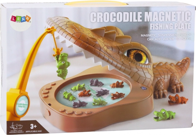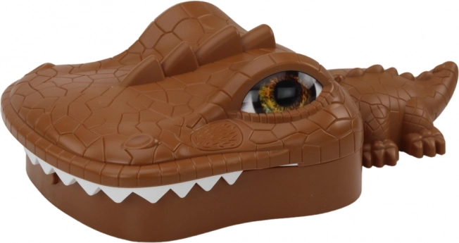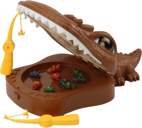 Velika plošča v obliki rjavega krokodila z odpirajočo se čeljustjo, premičnimi elementi in barvitimi »ulovi« za neskončno zabavo.