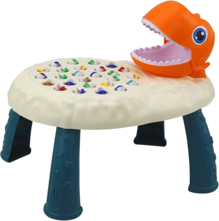 Vesela dinozavrova mizica spremeni lov na ribice v napeto tekmovanje. Odpirajoča se usta oranžnega dinozavra služijo kot cilj, kamor igralci odlagajo ulovljene ribice. Otroci med igro razvijajo natančnost, osredotočenost in zdravo tekmovalnost, hkrati pa se neizmerno zabavajo.