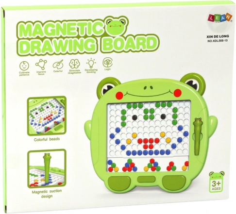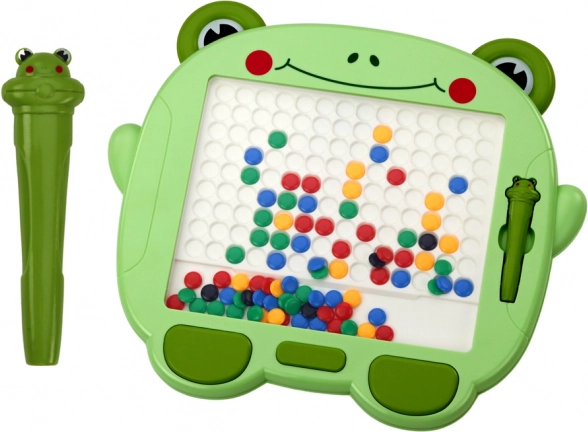 V središču se nahaja velika bela površina z zavihki, ki je idealna za razporejanje magnetnih kroglic. Iz kroglic v različnih barvah – črni, modri, rumeni, rdeči in zeleni – je mogoče ustvarjati različne vzorce in slike. Prek prozorne stene, ki ščiti risbo pred nenamerno poškodbo, lahko otroci poljubno oblikujejo svoje kompozicije s pomočjo posebnega magnetnega pisala z motivom žabice.
