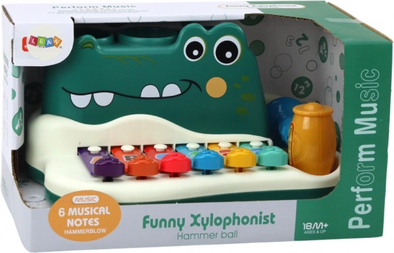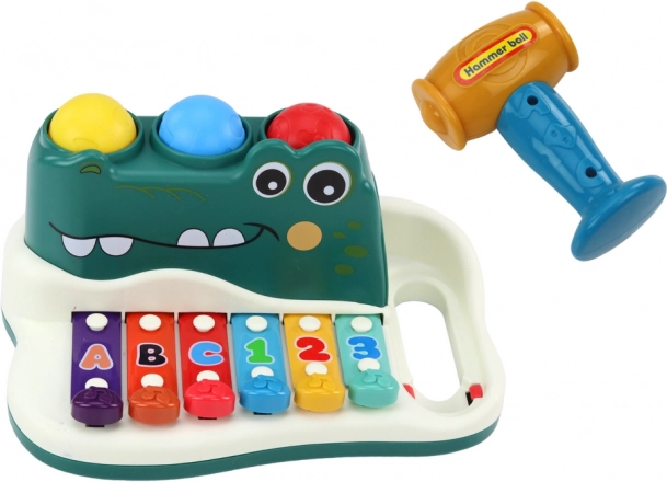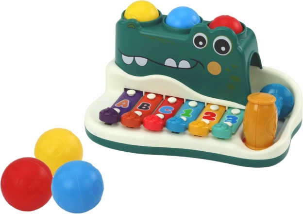 Prisrčen krokodil združuje ksilofon, klavirček in interaktivno igro z žogicami v eni igrači. Otroci lahko udarjajo s paličico po barvnih lamelah ter urijo motoriko, sluh in prepoznavanje številk ter črk. Varna zabava s certifikatom CE in skladnostjo z EN71 za otroke od 3 let.