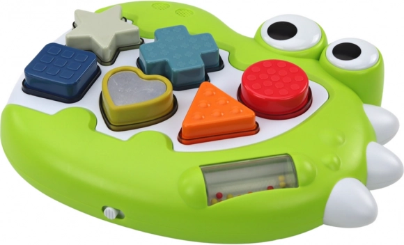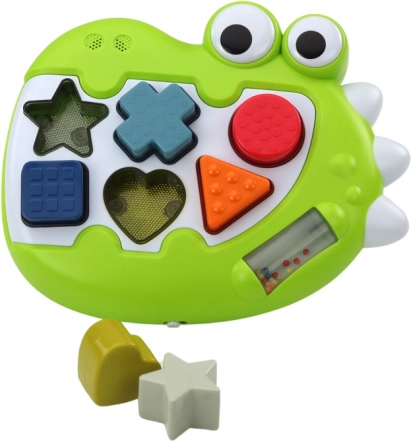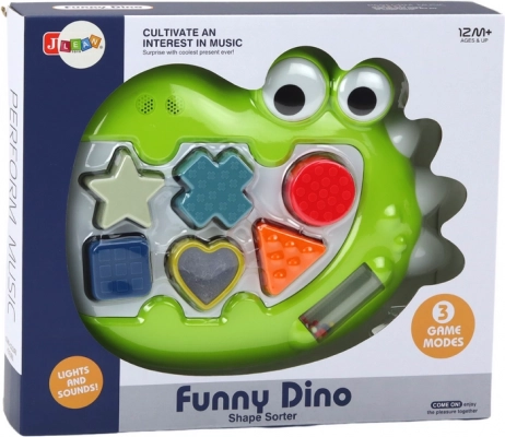 Ta interaktivni dinozaver združuje pametno igro s senzorično stimulacijo. Po vklopu se odprtine za oblike osvetlijo, ob pravilnem vstavljanju koščka pa zaigra vesela melodija, ki otroka motivira k nadaljnjim poskusom. Otroci se naravno učijo prepoznavati oblike in barve, urijo koordinacijo oko–roka ter odkrivajo zvočne in tipne dražljaje.