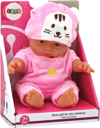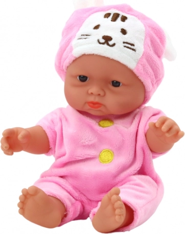 Prisrčna majhna dojenčkova punčka je idealna prijateljica za otroško igro. Ima rožnato oblačilo z rumenimi gumbi, ljubko kapico z ušeski kot zajček in premične rokice, nogice ter vrtljivo glavico. Odlično spodbuja domišljijo in fino motoriko otrok.