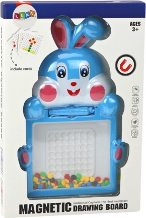 Magnetna tabla zajček ponuja neomejen prostor za domišljijo malih umetnikov. Vsebuje barvne kroglice v različnih odtenkih, ki spodbujajo ustvarjanje fantastičnih slik in vzorcev. Posebno magnetno pero omogoča otrokom neomejeno manipulacijo s kroglicami, kar razvija natančnost gibov in ročne spretnosti.