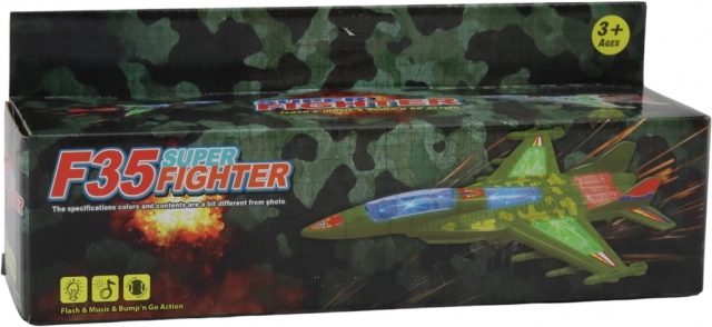 Zeleno vozno lovsko letalo za male pilote ponuja utripajoče luči, glasbo in realistične zvoke motorja ter način bump‑and‑go, ki se samodejno izogiba oviram. Realistična kamuflaža, prozorna kabina in trpežna plastična izdelava zagotavljajo dolge ure zabave. Izpolnjuje standarde CE in EN71.