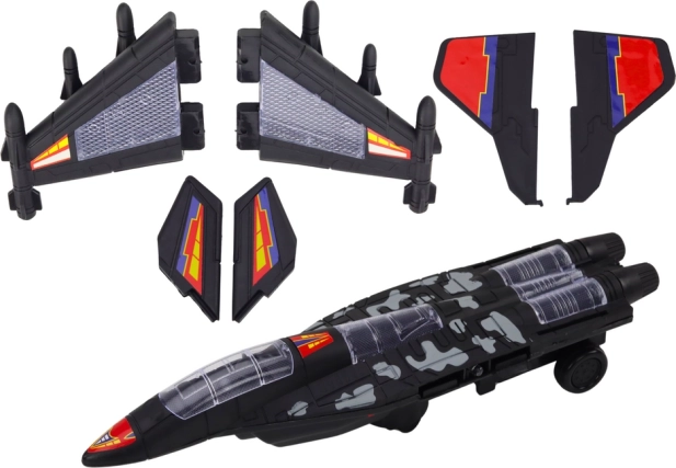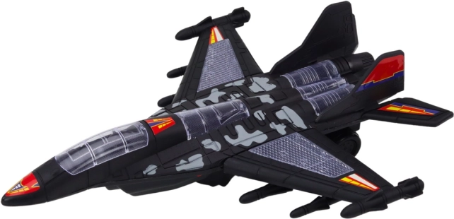 Črna izvedba s kamuflažnim potiskom, izraziti detajli kril in oborožitve ter aerodinamična oblika spodbujajo otroško domišljijo in igri dajejo avtentičnost.