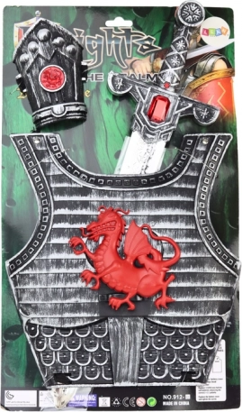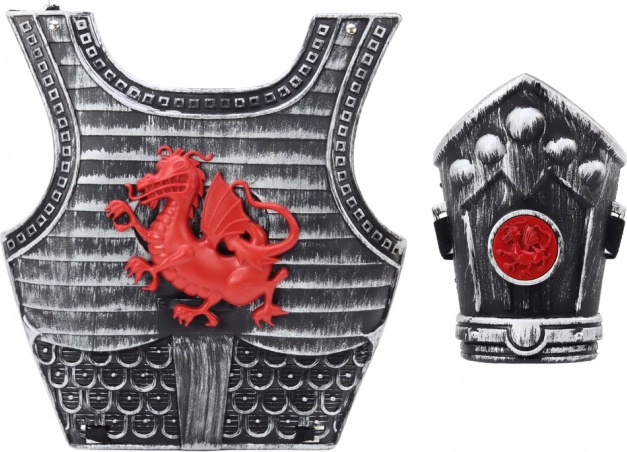 Ta otroški viteški kostum je zasnovan za domiselno igro vlog in pustne preobleke. Oklep z rdečim zmajem, stilen meč in ščitnik tvorijo uravnotežen trojček dodatkov, ki vsakemu malemu bojevniku dodajo samozavest in pristnost. Trpežna plastična izvedba in dodelani detajli podpirajo dolge ure varne igre.
