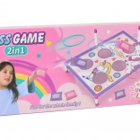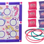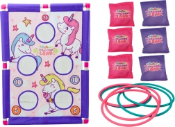 Igro sestavlja trdna, barvita igralna deska, okrašena s slikami ljubkih samorogov, ki ne le spodbuja igro, temveč tudi navdihuje otroško domišljijo. Igralna deska vsebuje točkovni sistem, ki igri doda element tekmovalnosti in vznemirjenja. Del kompleta so posebej oblikovane vrečke za metanje za stabilen let in natančnost zadetka ter barvni obroči.