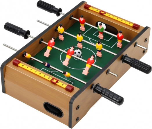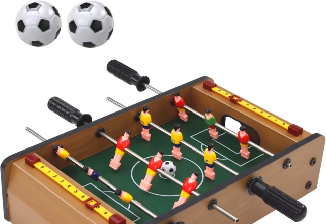 Mini namizni nogomet iz lesa: kompaktne mere, trdna konstrukcija, barvne ekipe in števci zadetkov. Certifikata CE, EN71. Odlična družinska zabava.