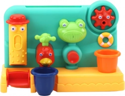 Ta pisana kopalna igrača spremeni vsako kopel v veselo dogodivščino. Voda, nalita v zgornjo odprtino, sproži kaskado učinkov: zavrti vodno kolesce, priteče iz pipe, ustvari fontanico in po pritisku na gumb teče curek iz ust prikupne žabice. Zahvaljujoč zanesljivim priseskom igračo zlahka pritrdite na gladke površine.