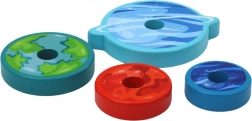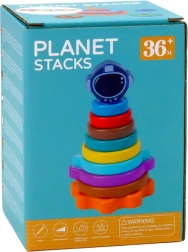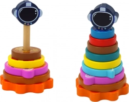 Lesena piramida za zlaganje z vesoljskim motivom združuje igro in učenje. Otroci razvrščajo barvne kroge – »planete« – po velikosti ter tako vadijo primerjanje, orientacijo in potrpežljivost. Končni del v obliki kozmične čelade doda zadovoljstvo ob dokončanju naloge.