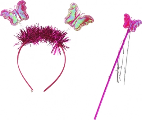 Set dopolnjujeta igriv naglavni obroč z metuljčki in rožnata paličica, ki otroškemu preobleki dodata pravo čarobnost.