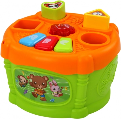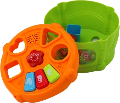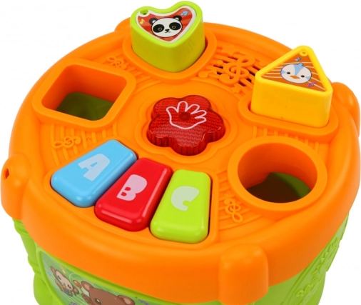 Interaktivna otroška igrača v obliki bobna z barvitim dizajnom združuje zabavo in učenje. Opremljena je z odprtinami za različne geometrijske oblike ter gumbi z oznakami 'A', 'B' in 'C', kar otrokom pomaga pri učenju oblik in črk.