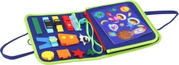 Vključuje različne manipulativen elemente kot so zadrge, gumbi in vrvice za razvoj fine motorike.