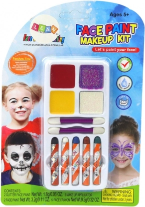 Komplet za poslikavo obraza je popolna oprema za nepozabno in ustvarjalno zabavo. Vsebuje posebne svinčnike in barvice za kožo, ki zagotavljajo varnost in enostavno odstranjevanje.