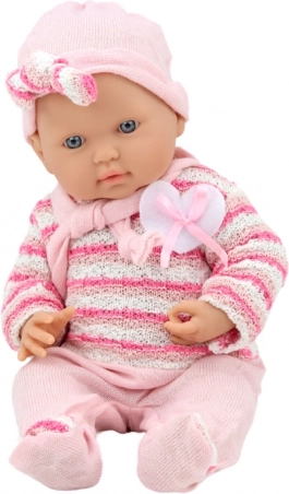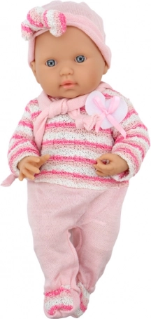 Čarobna punčka dojenček v rožastem črtastem puloverčku s kapico in šalom bo razveselila vsako malo negovalko. Ima realistične poteze in premične roke ter noge, izdelana je iz varnih in trpežnih materialov. Dimenzije punčke 39 × 18 × 10,5 cm, starost 18+ mesecev, certifikata CE in EN 71.