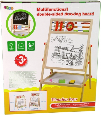 .Dvostranska izobraževalna risarska tabla z abakom, uro in abecedo je izjemno razvojno orodje za najmlajše. Izdelana je iz masivnega lesa, kar zagotavlja trpežnost in varnost pri igri. Njena vrtljiva konstrukcija omogoča uporabo dveh različnih površin: ena je prekrita s črnim materialom, idealna za risanje s kredami, druga pa je bela, primerna za risanje s flomastri.