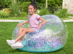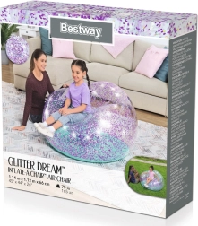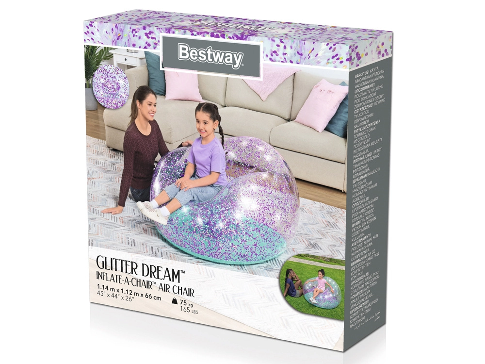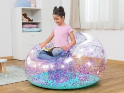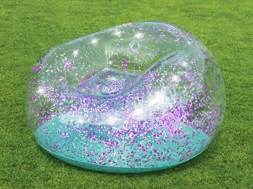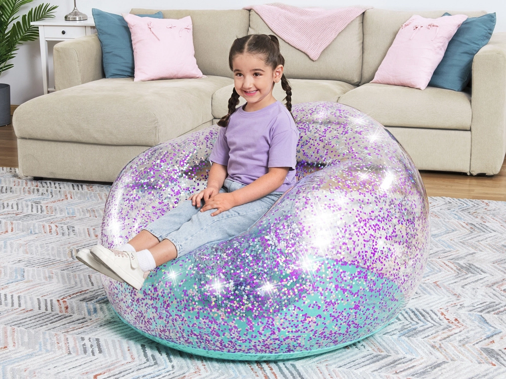 Napihljiv bleščičasti naslanjač Bestway Glitter Dream je popoln dizajnerski kos za otroško sobo ali kot modno vrtno pohištvo za mladino. Naslanjač je izdelan iz prozornega PVC-materiala, napolnjenega z bleščečimi bleščicami, kar mu daje vesoljski videz, ki popestri vsak prostor.