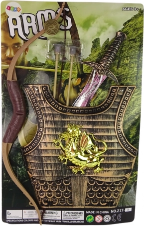 Celoten komplet samurajskega kostuma za otroke vsebuje zlati oklep z motivom zmaja, ki ga enostavno prilagodite z elastičnimi gumijastimi trakovi. Kostum je opremljen s udobnim mečem z različnimi vzorci na ročaju in lokom za natančno streljanje na daljavo.