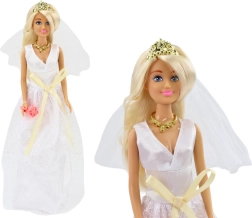 Lutka drži šopek rožnatih vrtnic, kar še dodatno poudarja njen avtentičen videz. Njeni dolgih blond lasje so lepo urejeni in prekriti s tančico, ki nežno pada na hrbet.