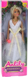 Predstavljamo lutko Anlily v poročni obleki, ki s svojimi natančno izdelanimi detajli pritegne pozornost vsakega otroka. Oblečena je v dolgih belih oblekah, ki poudarjajo nežnost in eleganco. Sprednji del obleke je okrašen z bež pentljo, kar dodaja celoten šarm.