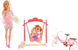 - Velika punčka 30 cm (členjena), mala punčka 16 cm, avto 33 cm, skuter 30 cm, kolo 17 cm, gugalnica, kužek, klobuk, čelada, nakupovalna torba