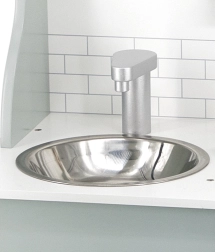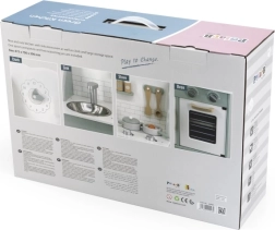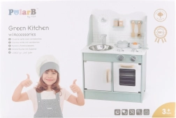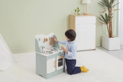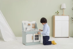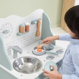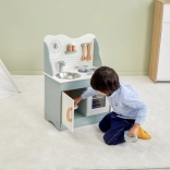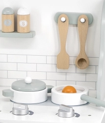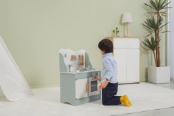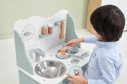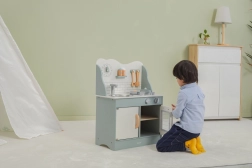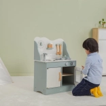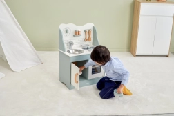 Po končanem kuhanju lahko otroci pomijejo posodo v koritu in shranijo živila v shranjevalno omarico pod koritom. Otroška kuhinjica je izdelana iz lakiranega lesa in pobarvana z nestrupenimi barvami v “polarnih” tonih. Spodbuja odgovornost in organiziranost med igro.