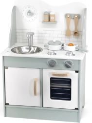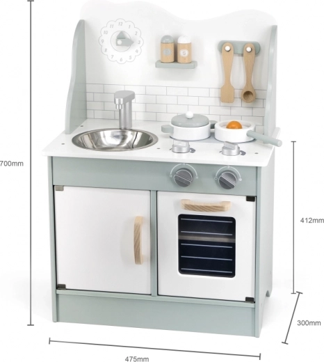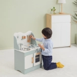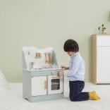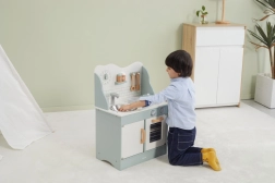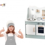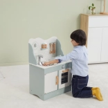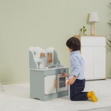 Otroška lesena kuhinjica je opremljena s koritom, pečico in štedilnikom za avtentično kuhanje.