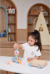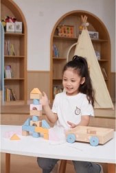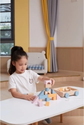 Kocke so narejene iz bukovega lesa, so pobarvane v harmonične barve in varne za otroke. Po igri se kocke lahko pospravijo nazaj v voziček, kar omogoča enostavno urejanje. S pomočjo vrvice lahko otrok vleče voziček s kockami po tleh, kar je ne samo zabavno, ampak tudi praktično.