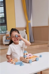 Leseni voziček VIGA PolarB za vlečenje je opremljen z 20 kockami v pastelnih barvah, ki ponujajo možnost gradnje domišljijskih stavb s pomočjo različnih oblik in tiskov. Voziček je zasnovan tako, da otrokom omogoča enostavno razvijanje motoričnih spretnosti in ustvarjalnosti. Pri igri se otroci učijo usklajevati svoje gibe in se osredotočiti na naloge.