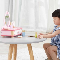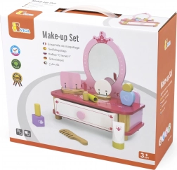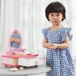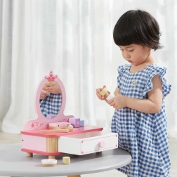 Set vsebuje lesene dodatke, kot so šminke, parfumi in senčila za oči, za ustvarjanje neskončnih igralnih scenarijev.